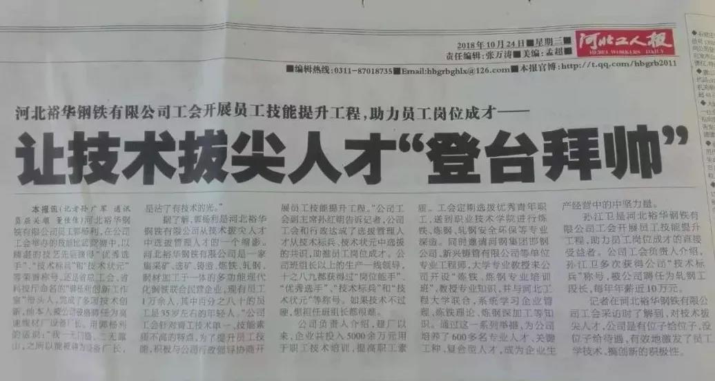 (《河北工人報(bào)》10月24日訊)武安市裕華鋼鐵有限公司郭楊利,在公司工會(huì)舉辦的技能比武競賽中,以精湛的技藝先后摘得“優(yōu)秀選手”、“技術(shù)標(biāo)兵”和“技術(shù)狀元”等榮譽(yù)稱號(hào),還是省總工會(huì)、省科技廳命名的“郭楊利創(chuàng)新工作室”帶頭人,完成了多項(xiàng)技術(shù)創(chuàng)新,他本人被公司破格聘任為高速線材廠設(shè)備廠長。